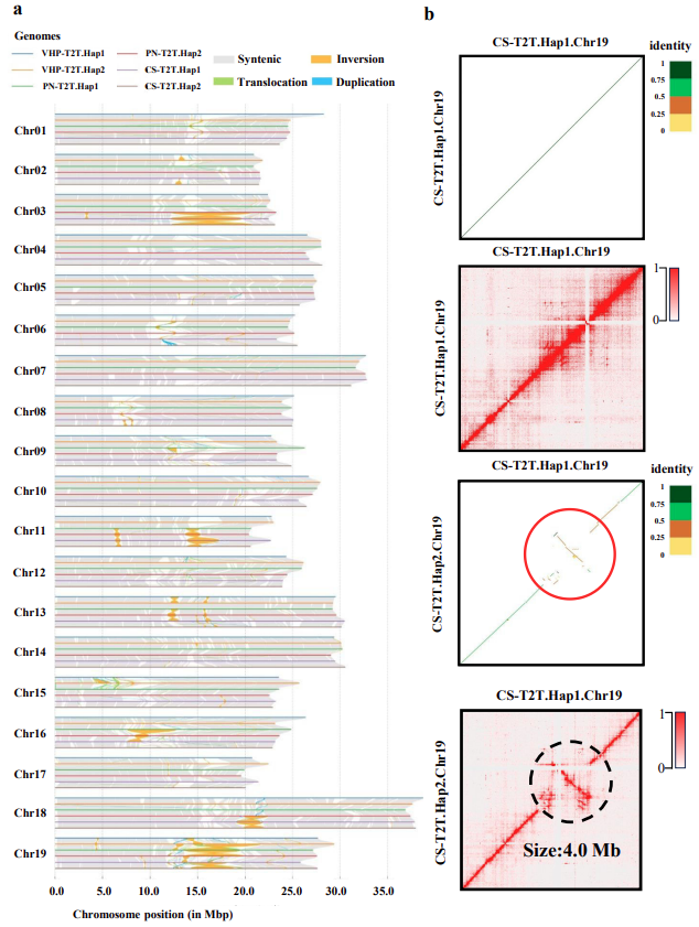 3、11、18、19 号染色体上发现了其他葡萄品种单倍型基因组中并不普遍的倒位区域,其中19号染色体上存在约4 Mb 的典型倒位片段。团队通过 Hi-C互作图谱、测序读段断点验证、多数据集交叉比对等多种手段,证实该倒位事件是赤霞珠葡萄的固有遗传特征,并非试验材料特异性变异,为解析赤霞珠独特农艺性状的分子遗传基础提供了关键线索,也为葡萄品种特异性状的遗传解析开辟了新方向(图2)。